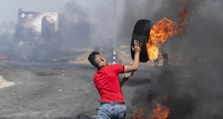 On the outskirts of Ramallah, Nablus and other towns and cities, Arab rioters waved Palestinian flags and trucked in tires to burn in order to create smoke screens from which they could attack Israelis.